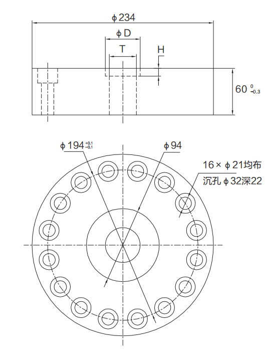 型號 | 量程(kN) | 量程(t) | D | T | H |