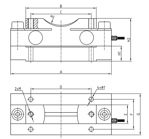 型號 | 量程(kN) | 量程(t) | A | B | C | D | E | F | G | H1 | H2 | M | R深 | φ1 |